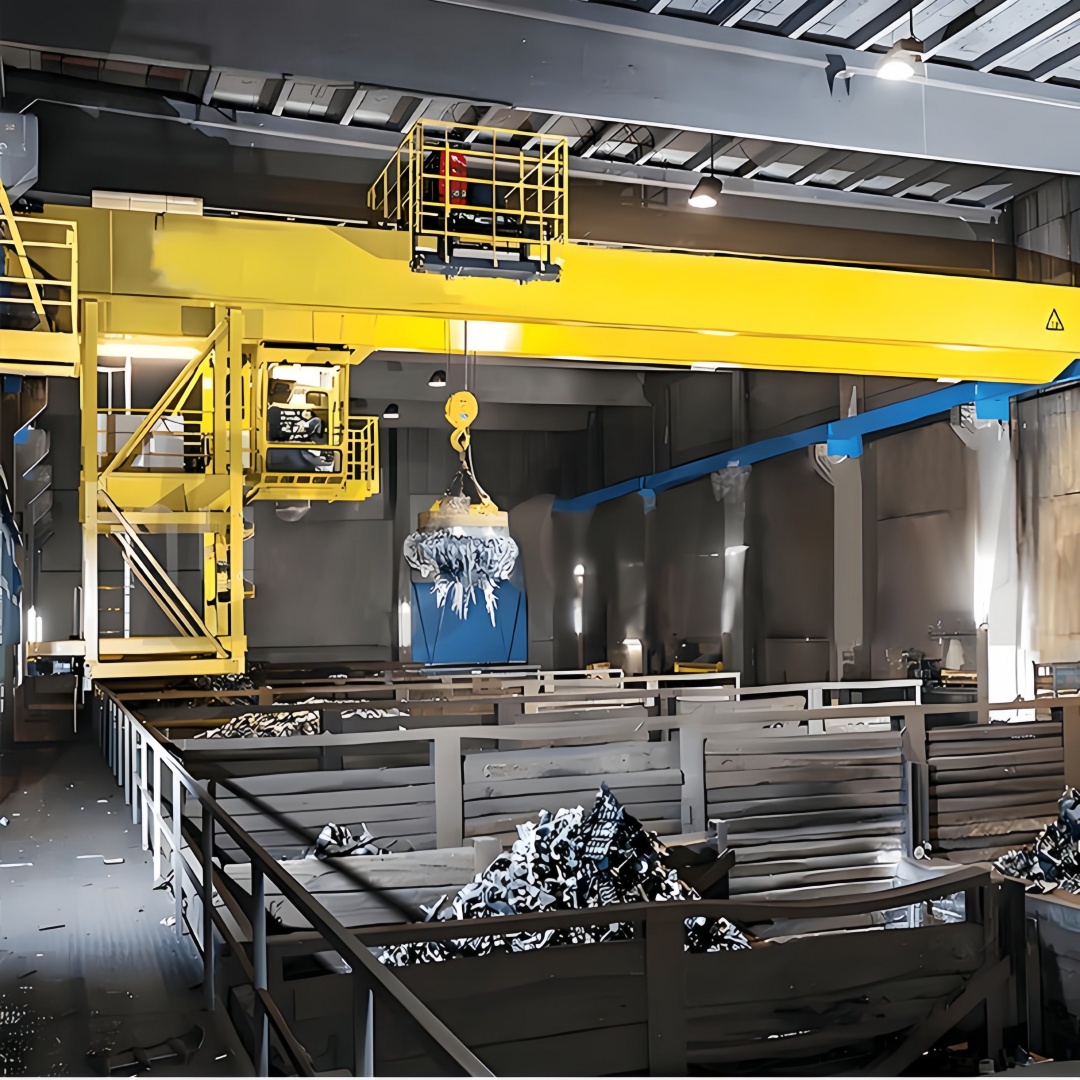 QC 型電磁橋式起重機(jī)是搭載電磁吸盤(pán)的橋式起重設(shè)備,以雙梁橋架為主體結(jié)構(gòu)(主梁與端梁連接成橋式框架),核心配置 “電動(dòng)葫蘆 + 電磁吸盤(pán)” 起升單元;通過(guò)端梁沿廠房軌道的縱向運(yùn)行、小車沿主梁翼緣的橫向移動(dòng),結(jié)合電磁吸盤(pán)的 “勵(lì)磁吸附 / 退磁釋放” 動(dòng)作,實(shí)現(xiàn)導(dǎo)磁性金屬物料(廢鋼、鐵錠、鋼坯等)的無(wú)捆扎快速吊運(yùn)。因其適配散料 / 工件的高效裝卸需求,已成為廢品回收、鋼鐵加工、機(jī)械制造車間的常用起重設(shè)備。