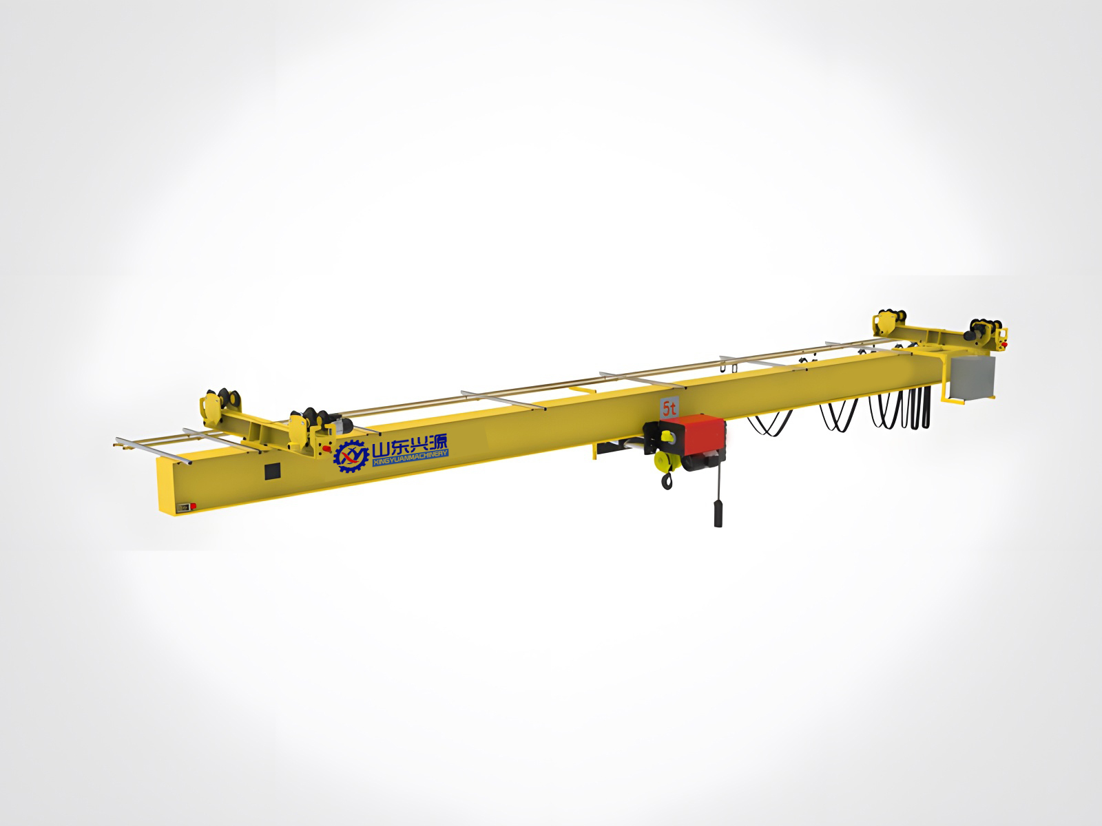 上的四具滑車懸掛在固定的工字鋼軌道下,這也是它得名“懸掛”的原因。這種設(shè)計(jì)使其無需立柱等基礎(chǔ),能最大程度地利用廠房空間。